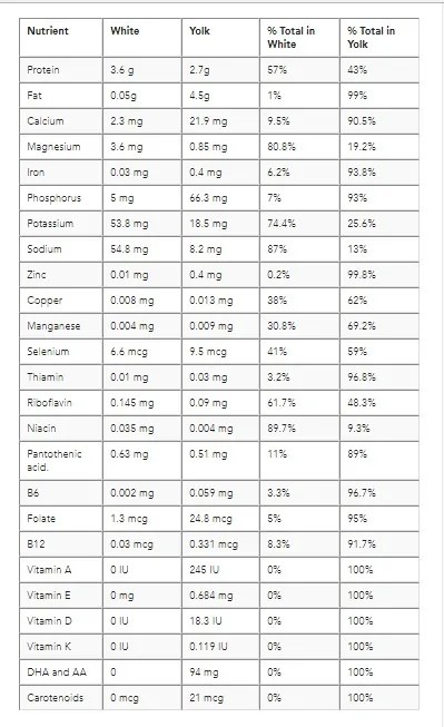 Menurut buku tabel komposisi pangan indonesia, dalam 100 gram telur dengan putih dan kuningnya mengandung kalori sebesar 154 kkal, 12,4 gram .